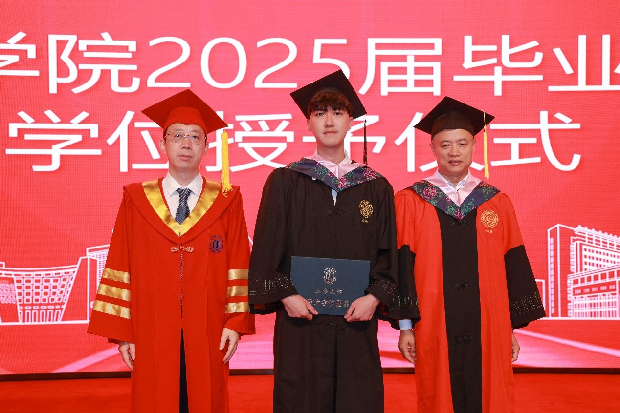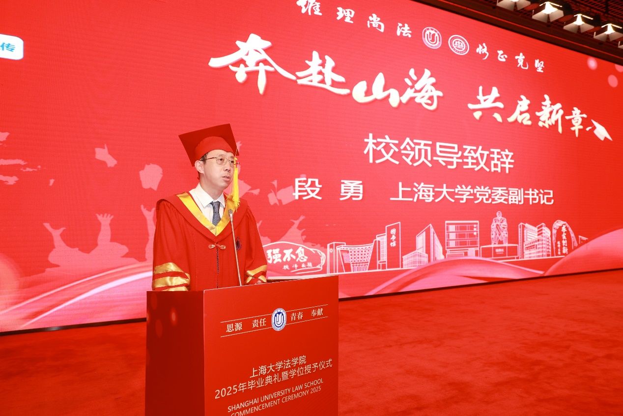 ac米兰官网中文网站党委副书记段勇教授为全体毕业生送上诚挚祝福与殷切嘱托,鼓励同学们在面对复杂社会环境与就业形势时保持积极的态度,通过这三句充满哲理的箴言,鼓励大家以开放心态、全面认知和人格平等的理念迈向未来,保持扎实与自信:“古今一也,人与我同耳”,寄语同学们学会换位思考,更好地认识自己与他人;“兼听则明,偏信则暗”,警醒大家要有意识地从不同渠道获取信息,保持全面的认知,避免陷入信息茧房;“己所不欲,勿施于人”,希望大家在今后的生活、工作中尊重他人,以真诚和善良对待。最后,段书记以于右任老校长与钱伟长老校长的“大任于斯,江山有待;伟业流长,自强不息”寄语全体毕业生,激励大家坚守信念,勇敢追梦。并衷心祝愿同学们前程似锦,未来可期!