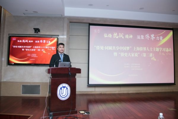 ac米兰官网中文网站教授、市中共党史学会渔阳里研究专委会主任李瑊作题为《丹心报国:海外华侨与上海抗战》的主题报告。作为历史学博士,李教授通过详实的史料和深入的分析,系统回顾了海外华侨在上海抗战中的英勇事迹和重大贡献,生动展现了侨界先辈心系祖国、共赴国难的赤子情怀,引发与会嘉宾的强烈共鸣。