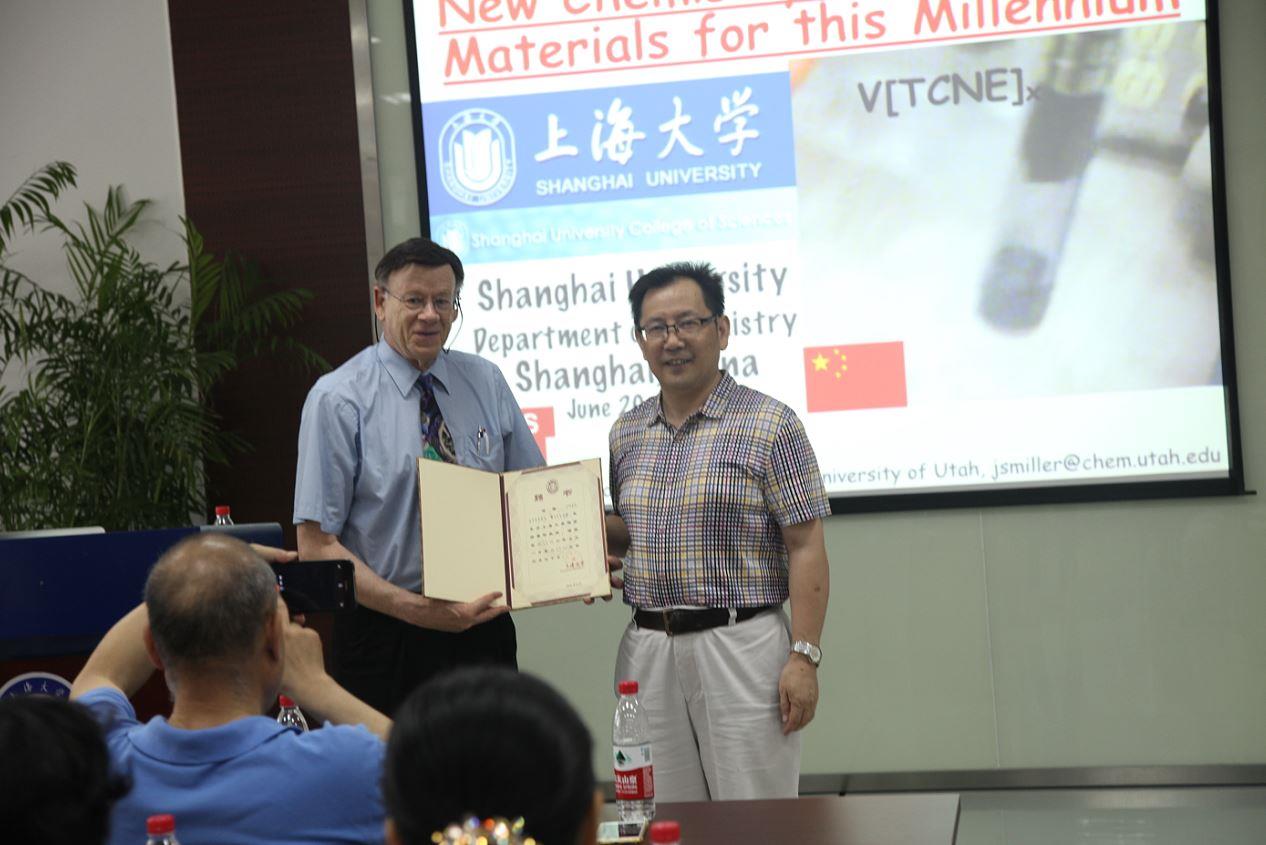 6月20日,应化学系柏跃玲副教授的邀请,美国犹他大学Joel S. Miller教授访问了理学院并授聘为理学院兼职教授,理学院党委书记盛万成教授出席了授证仪式,并颁发了证书。随后,Joel S. Miller教授为师生们做了题为 “Organic-based Magnets: New Chemistry, Physics, and Materials for this Millennium” 的学术报告。该报告是理学院当代科学前沿讲坛第225讲暨化学系今日化学学术报告第165讲,报告会由化学系朱守荣教授主持。化学系徐甲强教授,李明星教授,物理系蔡传宾教授、曹世勋教授等70余名化学系、物理系、ac米兰官网中文网站国际量子中心、纳米中心和材料学院的师生聆听了此次学术报告。