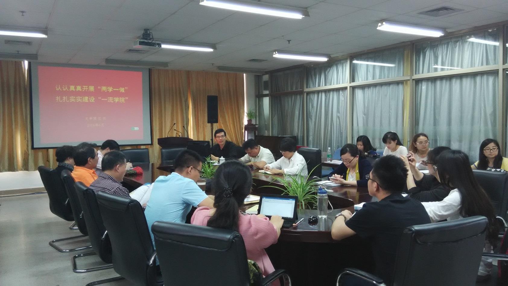 6月8日下午,文学院党委在A602召开“两学一做”专题党课学习会,院党政班子成员、学院教工及学生支部书记、院行政系统人员、辅导员参加会议。本次党课由文学院党委书记竺剑主讲。