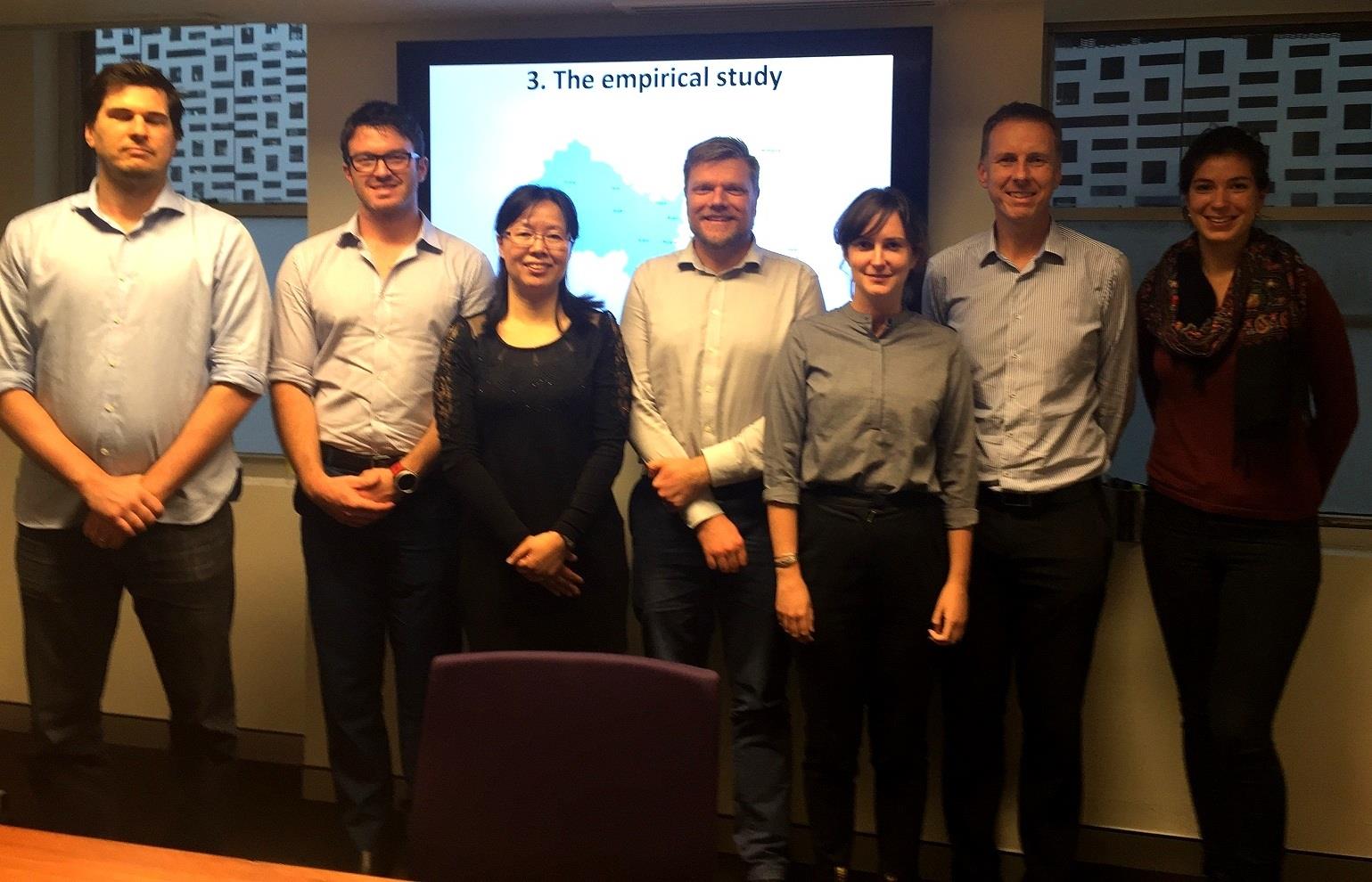 吕康娟教授介绍了目前中国关于碳排放和环境治理的现实状况、相关学术研究前沿,并运用投入产出模型着重分析中国不同区域和不同省份的能源排放效率差异,依据各区域能源效率特点,对环境政策的制定提出建议。可持续发展研究院研究员对此研究课题表现出浓厚兴趣,尤其针对中国环境的区际差异、能源政策和环境治理等提出了一系列问题,与会人员进行了深入讨论。吕康娟教授还向参会研究员介绍了悉商学院的研究情况,该研究方向的团队成员情况。研究院表示欢迎悉商同方向的教师来学术交流。