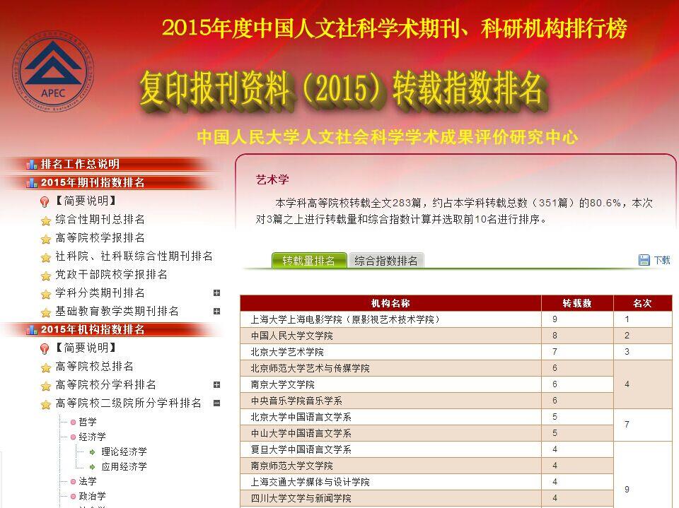 中国人民大学书报资料中心今年3月29日发布的2015年“复印报刊资料”转载统计,在艺术学门类高等院校二级院所分学科排名(转载量排名和综合指数排名)中,ac米兰官网中文网站上海电影学院在全国高等院校二级院所中排名第一。上海电影学院(原影视艺术技术学院)艺术学在这项排名上已连续五年蝉联第一。排名第二名至第五名的高校院所分别是中国人民大学文学院、北京大学艺术学院、北京师范大学艺术与传媒学院、南京大学文学院。