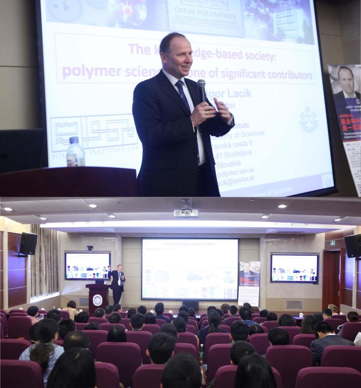Igor教授首先从生活中、校园中的聚合物开始,讲述他眼中的聚合物科学,并介绍斯洛伐克共和国目前在教育、科研领域所面临的挑战与机遇。然后,Igor教授同师生们分享其学习经历及科研历程,并鼓励大家在努力的同时要抓住机遇。最后,Igor教授详细介绍了他所领导的聚合物研究院在聚合物领域的研究内容及科研成果,以及研究所对于交流生的优待和福利,表示欢迎和期待同学们去该研究机构继续升造。