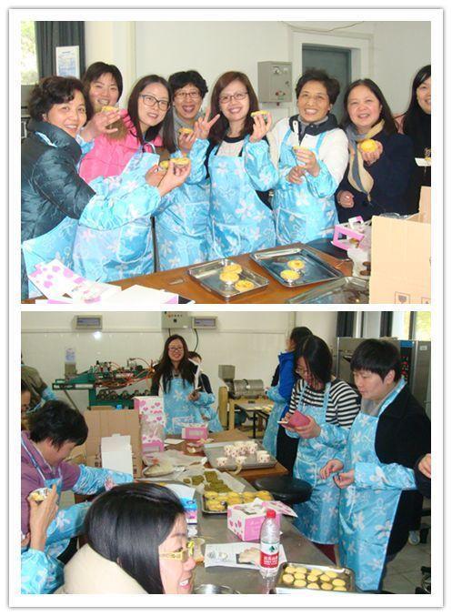 由于场地和考试周监考等原因,活动分成了上午和下午两场。上午8点半,第一批近30位女老师就早早来到了生命学院食品专业的实验室,在生命学院吴老师的指导下,女教师们开始现学现做曲奇饼干、哈雷蛋糕和蛋挞等西点。