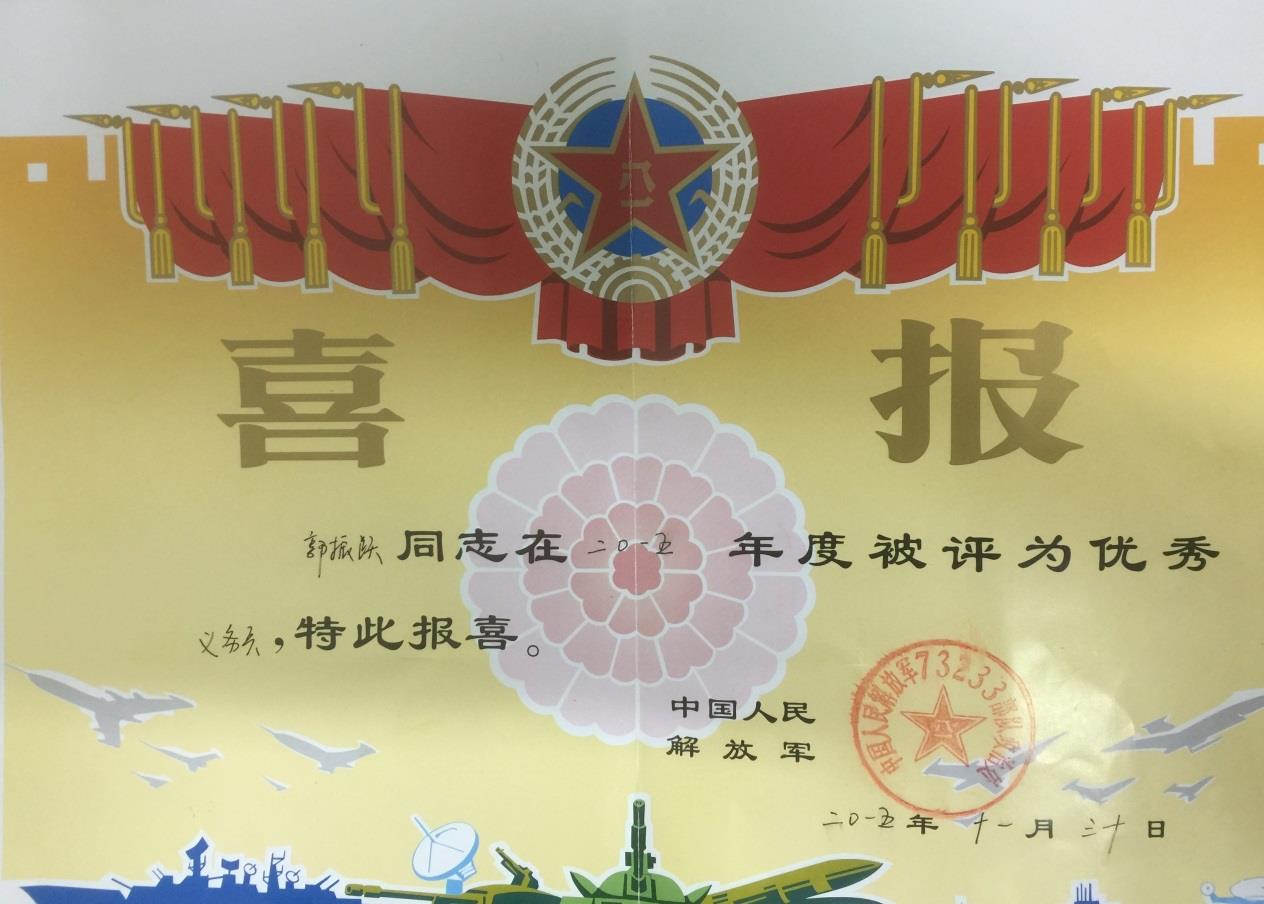 因服役期间表现优秀,郭振跃于2015年11月30日被中国人民解放军73233部队政治处评为2015年度优秀义务兵,特此报喜。