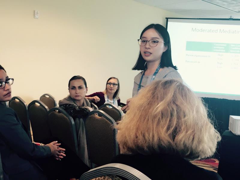 在导师蔡震尧、霍伟伟指导下,吴丹丹同学做关于”Formal Mentoring,Person-environment Fit, and Newcomer’s Intention to Leave”的演讲:揭开在中国情境下正式导师制对新员工离职倾向作用的“黑箱”,探索员工不确定性规避程度的差异对这一作用的影响。作为会上唯一一做论文宣讲的在读硕士研究生代表,吴丹丹同学以流利的英文,严谨的逻辑获得了与会学者的一致好评。一年以来,吴丹丹同学在两位导师的耐心指导下,不仅接受了系统的定量研究的训练,在案例研究方面取得了一定的成果。此次汇报更是受到了AMR现任主编Ragins教授的特别称赞。