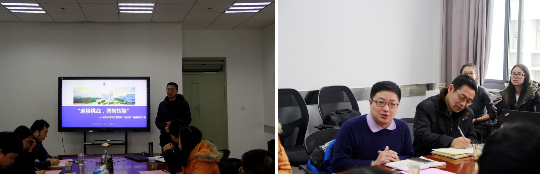 材料学院青年教师、兼职辅导员黄璐博士介绍了“‘迎接挑战,勇创辉煌’——2017年挑战杯材料学院竞赛项目筹备和推进方案”。方案详细梳理了学校、学院参加历届“挑战杯”的相关历史;学院备赛推进的具体模式思考(大团学工作模式);学院变三级竞赛为四级竞赛的实践情况(设立院级“材冠杯”进行项目遴选);“挑战杯”学院备赛工作组人员组成以及往届获得全国“挑战杯”特等和一等奖的材料学科相关参赛项目与学院学科研究方向对接和排摸情况。通过详细的梳理和排摸,对标历届优秀项目,学院将更好的开展前期的项目准备和实践。