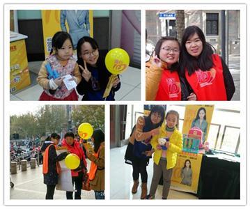 几个网点,或远或近,在组长的带领下,我们的志愿者扛着长枪短炮——各式各样的劝募物资,先后来到自己的“战场”,准备迎接一天的挑战。拉横幅、竖展牌、打气球、摆物品、贴海报,刚到劝募地点,志愿者们就迅速进入状态,开始布置现场。在大家齐心努力之下,布置后的现场慈善氛围浓厚,暖暖的色调、飘动的气球、斑斓的画笔、海报上孩子们的笑脸触动了志愿者心中最柔软的部分。在正式开始劝募之前,志愿者们集聚在一起,将手叠放,一同鼓气,为自己加油,为贫困山区的孩子们助力。