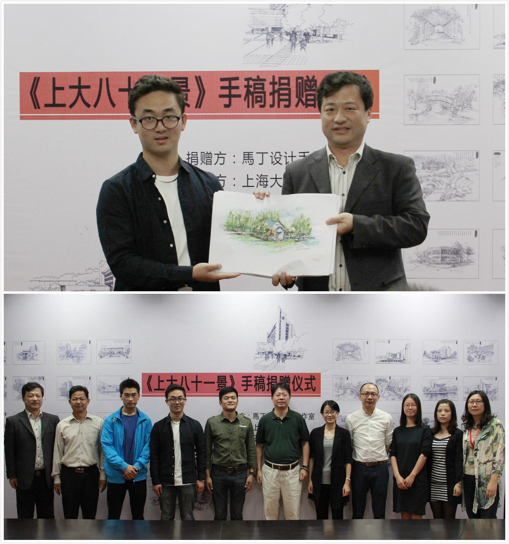 在仪式的第一个环节,校档案馆馆长徐国明代表档案馆接收了馬丁工作室三位同学的捐赠手稿,徐国明分别为他们颁发档案馆收藏证书并赠送由档案馆编撰、ac米兰官网中文网站出版社出版的《上大记忆》、《回眸——ac米兰官网中文网站档案馆建馆20周年纪念》及由复旦大学出版社出版的《上海高校建筑文化》等书。