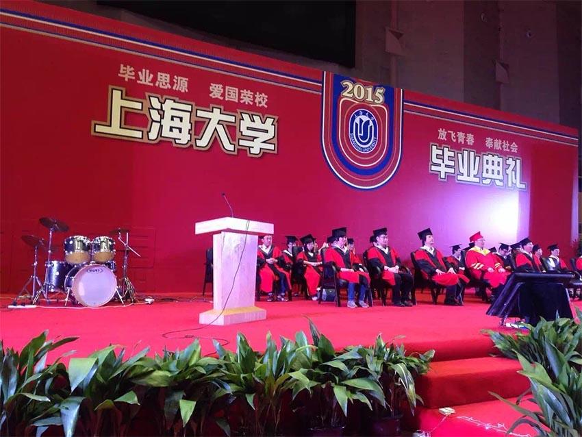 毕业典礼上,优秀校友代表丁盈学姐上台发言。身为上海青年电影制片人的丁盈学姐向在座的学弟学妹们分享了自己的大学生活与工作情况,希望可以用自己的人生经历激励更多的上大学子,在未来的人生路上肩负责任、勇往直前。