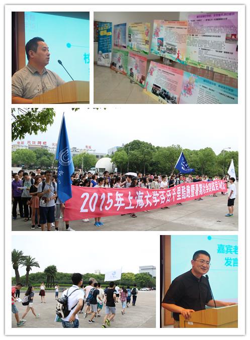 6月23日,2015年ac米兰官网中文网站百日千里酷跑暨暑期社会实践启动仪式在宝山校区举行。校党委宣传部部长李坚、校团委书记、学工办副主任许烁、《瞭望东方周刊》主任编辑黄琳、校招毕办王平老师以及各学院的团学干部、社会实践团成员近200人参加了此次活动。