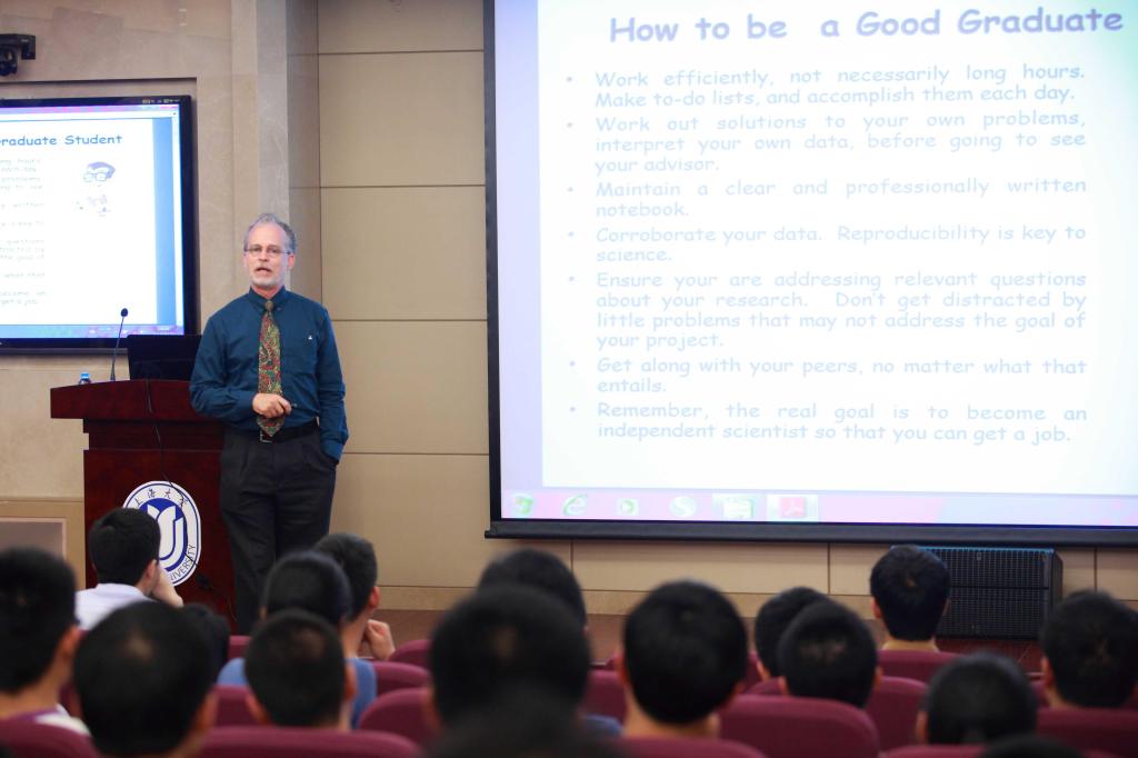 Anslyn教授首先从自己的学习工作生涯经历入手,提出他认为成功的研究生应该具有的要素和品质包括能高效工作、学会自己解决问题、有良好的组织、记录、整理的习惯,目标明确并与同学保持良好的关系等。他认为博士生学习的目的是如何成为一个独立的优秀研究者。之后,Anslyn教授也列举了成为博士后的一些要素,其中最重要的是要具备一定的科研领导能力。另外,Anslyn教授还详细介绍了学术界工作的面试程序和技巧。在报告的后半部分,Anslyn教授则针对如何成为一名出色的学者和研究人员做了细致的分析,并指出申请经费、发表高水平文章、得到校外知名教授的推荐信是获得良好评价并在美国成为终身教授的关键。