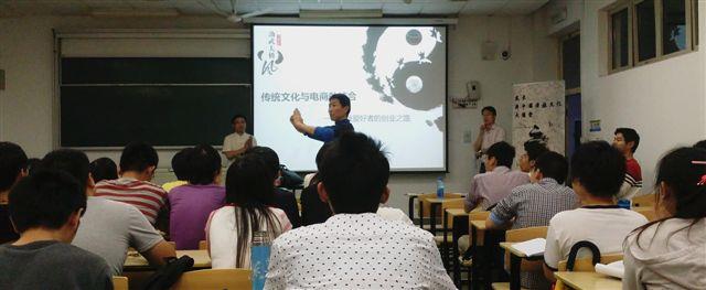 5月14日晚上,上海劲武太极文化传播有限公司董事长、业界称为“传统太极产业电商化第一人”的赵培金先生走进我院首期“武术与传统文化大讲堂”,在校本部AJ104教室以“传统文化与电商的结合——一个太极爱好者的创业之路”为主题做了精彩的讲座。本次讲座由武剑教研室申亮老师主持。武剑教研室的王光、徐春毅、周艳等老师以及60余名学生参加了此次活动。