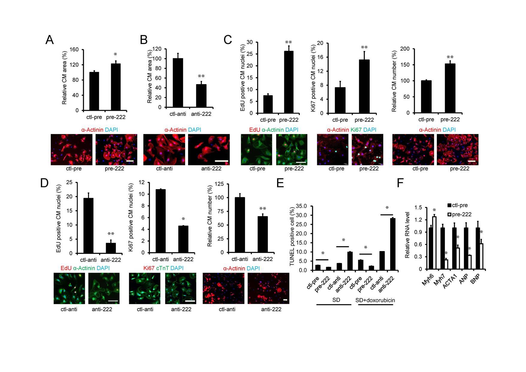 该研究发现,微小RNA-222在游泳和跑步二种不同的运动方式诱导的生理性心肌肥大中均显著性的升高,且它的升高特异性的发生于心肌细胞。细胞水平的研究发现,增加微小RNA-222的表达量可以促进心肌细胞的肥大和增殖,而降低微小RNA-222的表达量可以减小心肌细胞的体积和增殖。此外,增加微小RNA-222的表达量可以抵抗阿霉素和去血清培养诱导的心肌细胞的凋亡。动物水平的研究发现,微小RNA-222的升高是运动诱导的生理性心肌肥大所必须。构建的可诱导心肌细胞特异性的微小RNA-222过表达小鼠对于心脏缺血再灌注损伤所致的心室重构具有保护效应,包括改善心功能、减轻心脏纤维化、降低凋亡以及促进新的心肌细胞的形成等多个方面。除了经典的微小RNA-222的靶基因P27之外,三个新的微小RNA-222的靶基因被鉴定,包括Homeobox-1、HIPK1和HIPK2。该工作将为运动康复训练心脏益处提供分子层面的更多理论基础,并有望以运动康复训练为手段,发掘出更多的新的治疗心力衰竭的靶点。