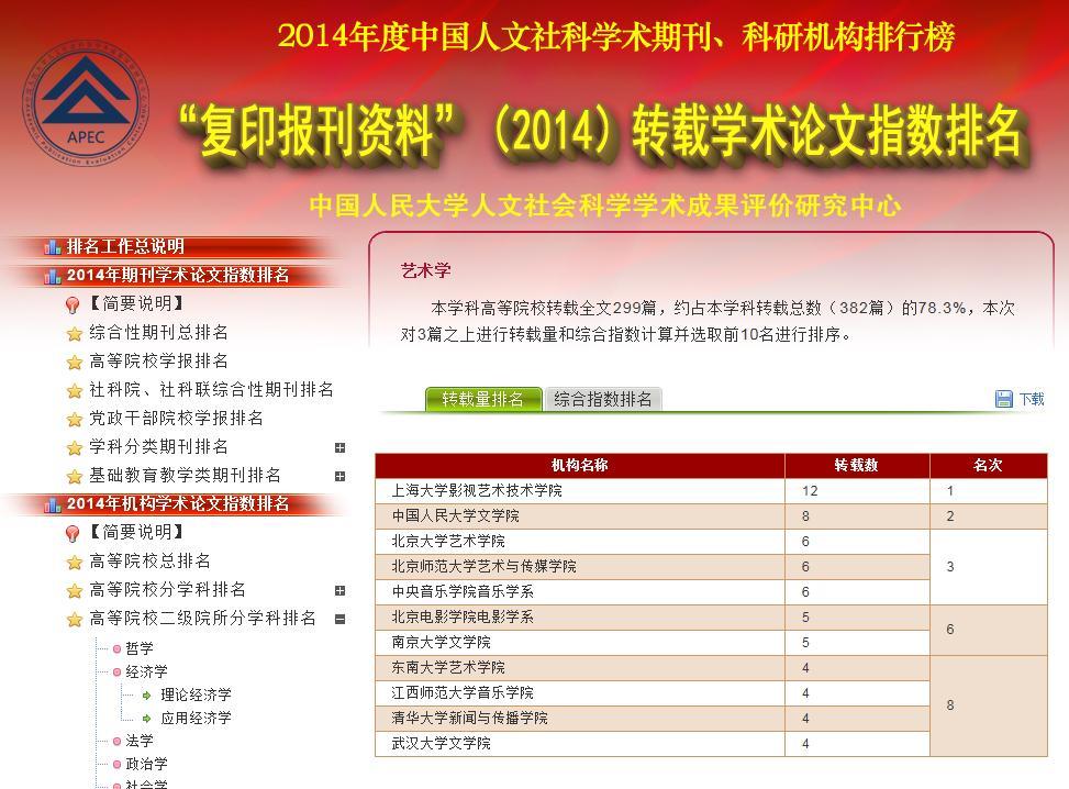 3月31日,2014年度“复印报刊资料”转载学术论文指数排行榜正式发布。在艺术学门类高校二级院所学术论文转载量与综合指数这两个核心指标方面,ac米兰官网中文网站影视学院稳居全国第一。排名第二名至第五名的高校院所分别是中国人民大学文学院、北京大学艺术学院、中央音乐学院音乐学系、北京师范大学艺术与传媒学院。
