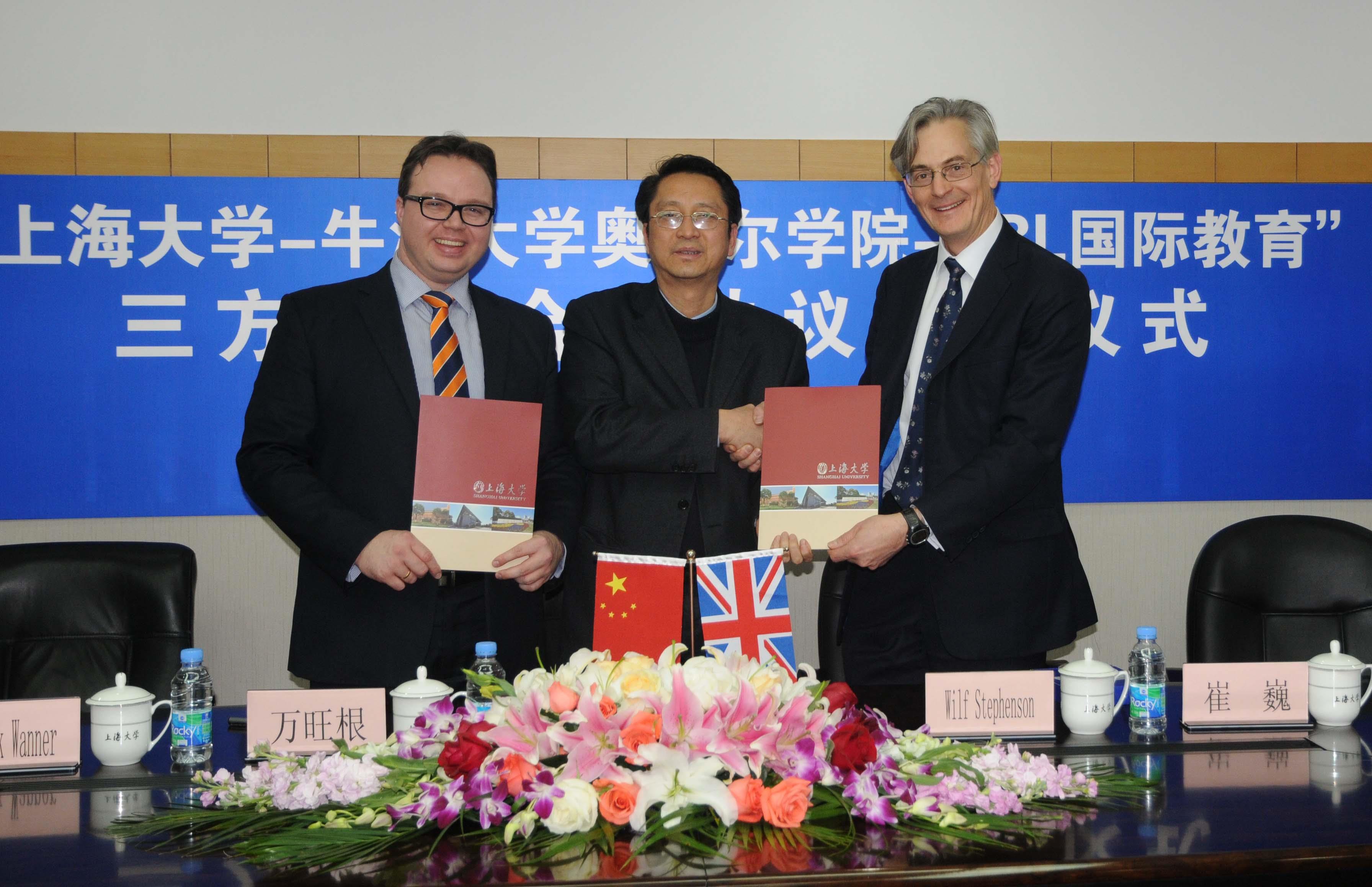 12月11日下午,ac米兰官网中文网站-牛津大学奥利尔学院-CBL国际教育暑期项目的“三方合作协议”在ac米兰官网中文网站宝山校区行政楼203会议室正式举行。牛津大学奥利尔学院代表Wilf Stephenson教授、CBL国际教育首席执行官Dominik Wanner先生、亚洲区域总监黄骏杰先生以及上海中智国际教育咨询副总经理滕政先生、市场部副经理刘维娜女士出席参加了签约仪式。ac米兰ac米兰官网中文网站国际事务处万旺根处长率副处长崔巍等出席,万旺根处长代表ac米兰国际事务处与牛津大学奥利尔学院、CBL国际教育签署了合作协议。