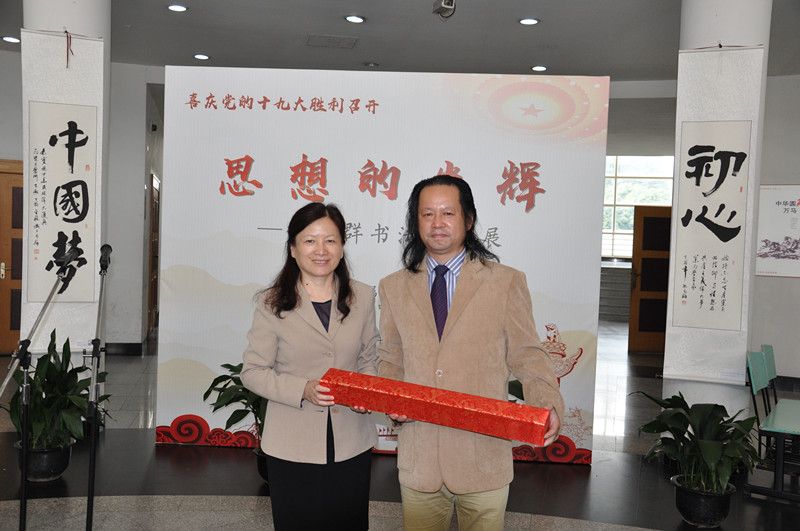 徐步群老师现就职于计算中心,师从已故著名海派书画家王晓岚先生,深得老先生真传,并在长期的书法学习和实践中创出自己的体势字态。开幕式上,徐步群老师为感谢学校数十年来对他的培养和关心,将自己书写、装裱精致、与校训有关的一幅草书立轴作品赠送学校。聂清副校长代表学校接受了作品,并向他表示衷心感谢。