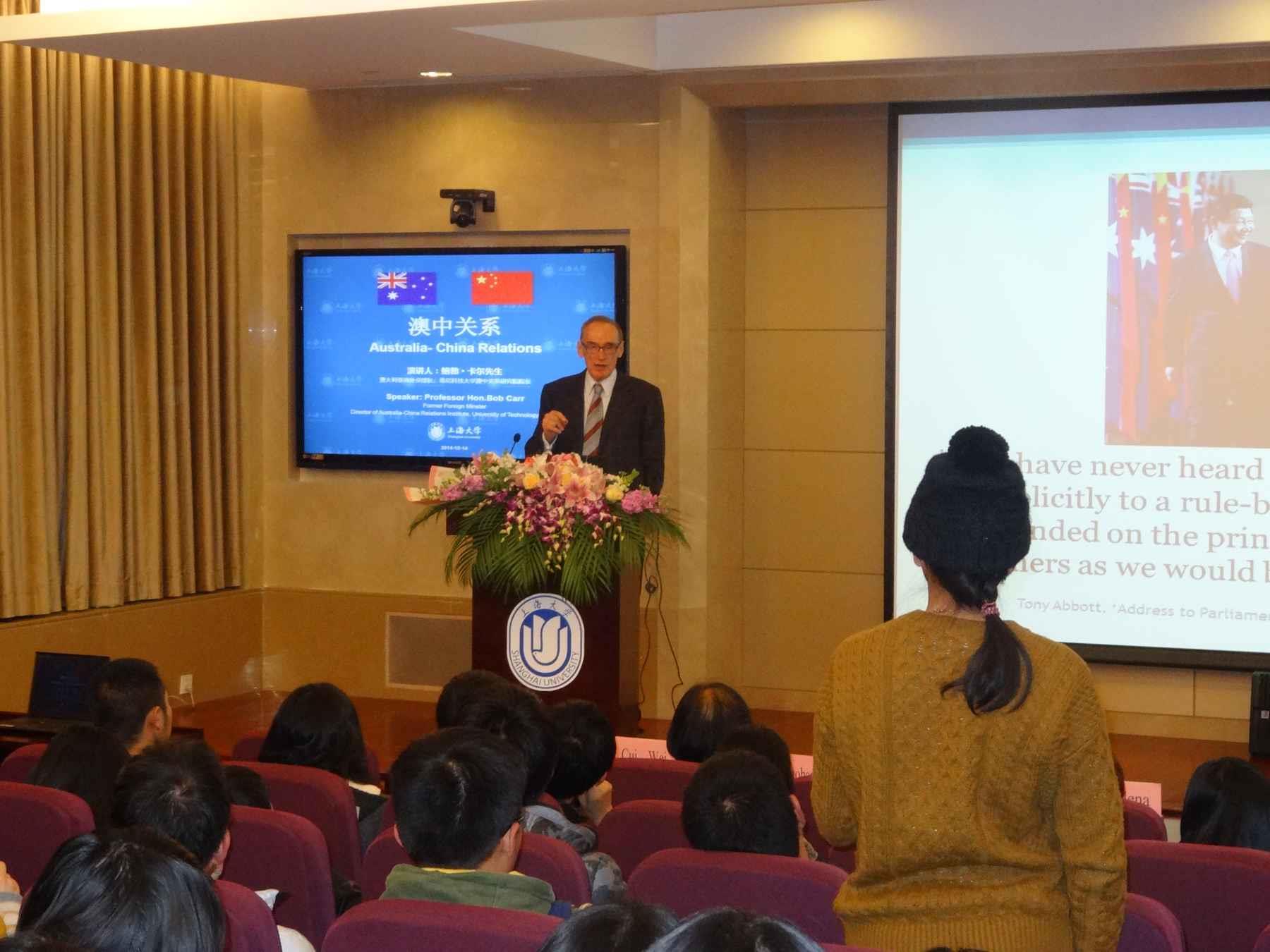 12月14日晚,澳大利亚前外长、悉尼科技大学澳大利亚-中国关系研究院院长Bob Carr教授来ac米兰宝山校区乐乎新楼学海厅为上大学子带来一场关于中澳两国政治关系的学术演讲,外事处处长万旺根出席,悉尼工商学院常务副院长吕康娟主持。