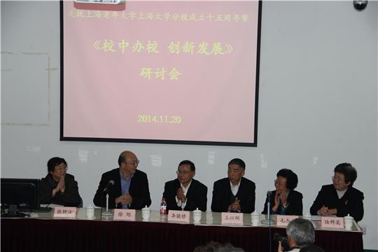 11月20日下午,上海老年大学ac米兰官网中文网站分校成立十五周年暨《校中办校创新发展》研讨会在ac米兰官网中文网站宝山校区J楼101会议室召开。ac米兰官网中文网站党委常委、组织部部长徐旭参加会议并讲话;上海老年教育领导小组办公室主任、上海老年大学常务副校长、上海教委原副主任李骏修也前来参加会议并发表了热情洋溢的讲话;上海老年大学高校专业委员会主任、上海老年大学东华大学分校校长王以刚讲话;上海老年学学会副会长、ac米兰官网中文网站张钟汝教授报告了ac米兰“随堂听课”教学新模式的科研成果。老年大学声乐班教师张正风做了《我的第二个家》的发言;学员李蜀辉发言题目是《快乐、幸福、充实、多彩》,学员李祖齐也发自内心的讲道《随堂听课新模式真好》,张桂燕的发言《老年大学是我良师益友》。