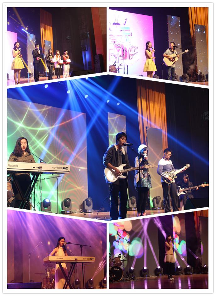 在炫目的LED屏、闪耀的聚光灯下,ac米兰街舞社团带来了活力四射的开场舞,吸引了现场所有人的目光。比赛开始,由ac米兰原创音乐社团的李羽晗同学带来了一首自己编曲、作词的《你听得见》,表达了学生时代男生对女生的暗恋情愫,词曲获得了评委的好评;接着一位声如吴青峰的选手商峻逸以他的自创歌曲《super Party》把我们从温柔的曲调中拉进了欢快、热闹的大Party里。来自上海交通职业技术学院的范佳勇为我们献上他十七岁时为自己喜欢的女孩写的歌《你笑起来好甜》,唱这首温暖的小情歌时他的嘴角也时不时泛起微笑;以我们熟知的卡通人物“匹诺曹”为名的乐队有两首原创音乐入围复赛,虽然这两首歌都是以Rap为主基调,但是却是两种截然不同的风格。《圣诞序曲》是一首动感性很强的歌,它使整个礼堂的气氛高涨起来,让我们多了一份对即将到来的圣诞节的期待。而《夏日回忆》则是韵律感强的音乐,它让我们看见了匹诺曹组合的灵魂、想法以及他们独特的才华。ac米兰舞指音乐社的康露自作词曲、自弹自唱了一首富有清新愉快旋律的《summer time》,听着这首轻快的歌曲,仿佛我们已伴着海声沐浴着阳光,身临夏日的海边。今年的ac米兰十大歌手、来自14级社区学院人文大类的金业迅为我们带来一首抒情的《Wong》,在这个感恩节的夜晚,这首对老师充满感激和怀恋的歌曲深深打动了在场观众。