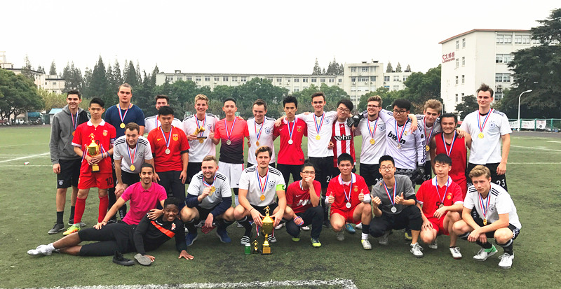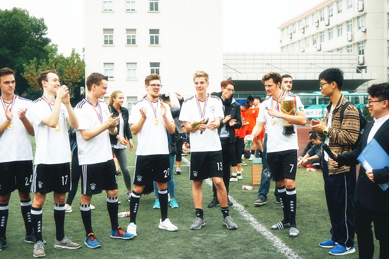 德国队队员身材高大壮硕,一开始势头很猛,中国队的队员们则发挥灵活敏捷的优势率先进球。随着时间一分一秒的流逝,双方一直僵持不下,一方进球,另一方不久又将比分拉平。随着上半场哨声的响起,双方队员进行了短暂的十分钟休息。大家纷纷聚在一起讨论战术,确认一对一攻防。下半场开始后,双方队员拿出十足的劲头破解对方的招式,场上不时响起喝彩声,比分一直被定格在3比3。离比赛结束不到十分钟的时候,德国队抓住一次绝妙的机会将比分最终锁定在4比3。至此,精彩的球赛落下了帷幕,双方分别评出了最佳球员和金靴奖球员得主,由学院青年教师为两支球队和个人奖得主颁奖。