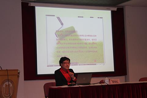 11月13日下午,全国高校辅导员工作研究会秘书处办公室主任、《高校辅导员》杂志常务副主编夏晓虹在校本部行政楼报告厅为全体学生政工干部作了题为“落实职业能力标准,提升辅导员科研素养”的专题报告,研究生工作部部长林海霞、学工办主任王军华与全体学生政工干部与会。