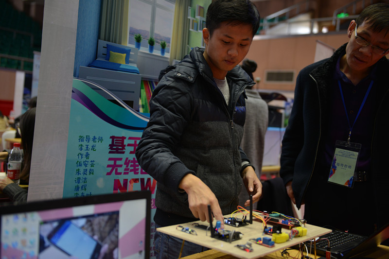 十点,现场评审专家分组评审正式开始。本次数媒竞赛总决赛参赛作品共分八类:游戏与虚拟现实、移动应用开发、影视与动漫设计、工业设计、建筑与室内外表现、数字艺术、数据可视化以及其他类。评审专家分为7个小组,每个小组由一位技术总监,一位市场总监和一位运营总监组成,从参赛作品的创意与主题表达、开发平台与技术难度、完成作品整体度、作品未来可推广及市场前景等多方面进行综合考量。所有的参赛队伍都拿出了自己最优秀的作品,在作品宣传、装置准备、作品答辩等方面下足了功夫。评审专家不仅仅是以专业的眼光审视各个作品,而且与参赛成员深入交流,提出可行的改进意见,帮助同学更好的完善作品,做到公平、公正评价每一个参赛作品。经过一整天紧张的评审和讨论,最终评选出一等奖作品40个,二等奖作品74个和三等奖作品137个。