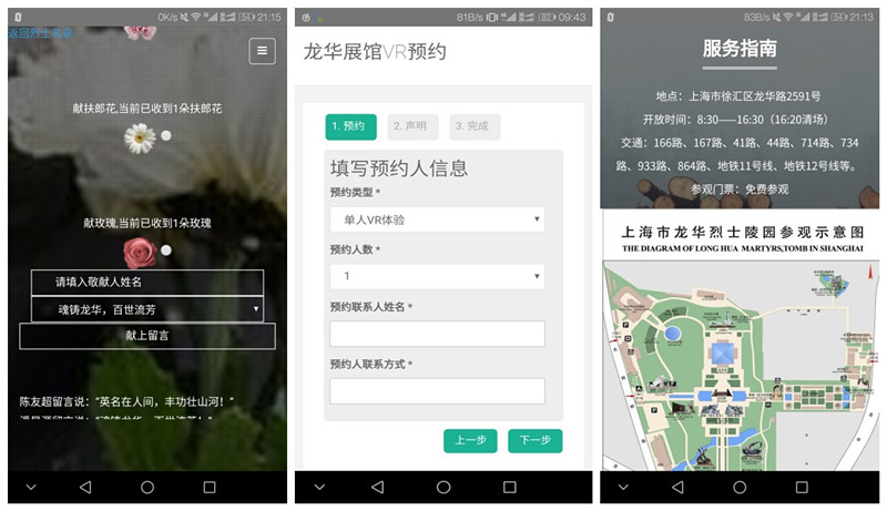 在整个项目中,郭玉桥同学主要负责沟通接洽及布置开发环节中的各项工作;陈友超同学负责统筹、整合项目,具体负责了服务指南、藏品展示、社教活动、展馆介绍、预约管理等模块以及现场服务器安装调试;潘昊源同学负责APP包装外壳,祭扫英烈、VR预约等主要功能的开发工作。经过两个月的不懈努力,开发的项目顺利完成并通过验收,APP投入使用。通过APP,参观者可以拥有一种移动式导览的体验,在未进入遗址馆内的时候可以先在APP上看到遗址馆的部分内容以及对于VR热门项目进行预约,同时还能在手机端对龙华英烈进行献花留言祭扫。该项目给参观者一种别样的方式去缅怀英烈,感受英烈思想,传承革命精神。