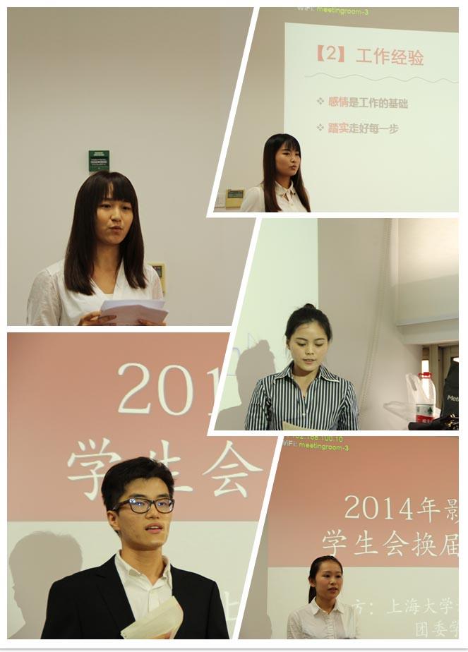 2014年9月12日下午三点整在ac米兰官网中文网站宝山校区a楼北区4003会议室举行了ac米兰官网中文网站影视学院学生会2014-2015届主席团换届大会。出席本次活动的有影视学院团委书记严瑶老师,各班班长、团支书,原影院学生会主席团成员,二十多名学生会骨干以及八名经前期推选参与主席团竞选的候选人组成。