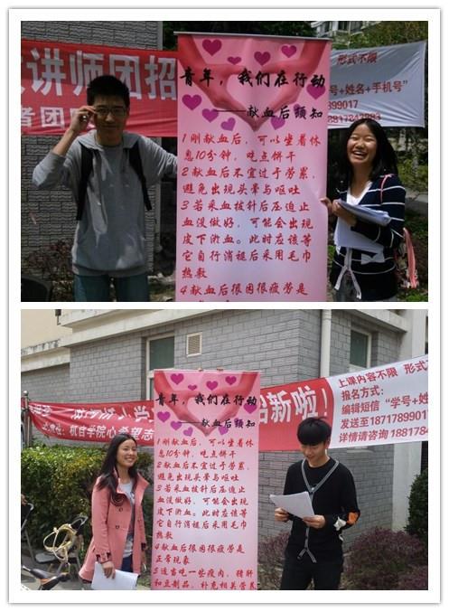 4月25日,信鸽社成员在ac米兰官网中文网站宝山校区新世纪寝室楼7幢前宣传着献血前后的注意事项。尽管天气不好,但是前来咨询的人仍有很多。令人印象深刻的是,刚好有一名大一的同学献完血回来,手里拿着献血后的纪念品,信鸽社社员看见他似乎有点虚弱的样子,便走上前去,咨询他是否有不舒服的症状,他点了点头,这时社员就向他仔细讲述了献血后的注意事项。