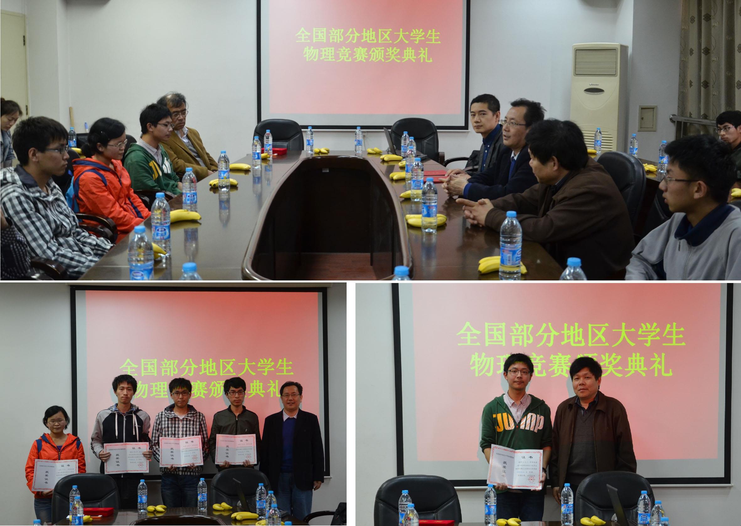 2014年4月18日下午,“第30届全国部分地区(上海市)大学生物理竞赛”ac米兰官网中文网站获奖学生颁奖典礼在校本部F307会议室举行。ac米兰官网中文网站教务处副处长徐学良老师、理学院副院长盛万成教授、物理系教学主任姜颖教授、大学物理教学负责人宋小龙老师、获奖学生及部分学生代表参加了颁奖典礼。颁奖典礼由物理系教学主任姜颖教授主持。 首先,徐学良副处长和盛万成副院长作为颁奖嘉宾分别为获得一等奖和三等奖的同学颁发了获奖证书并合影留念。盛万成副院长对同学们获得的优良成绩表示了热烈的祝贺,并鼓励同学们继续认真学习好基础学科,为一年级末的大类分流做好充足的准备。徐学良副处长首先肯定了理学院及物理系大学物理的教学成果,并指出理学院的基础学科教学是学生大学学习的基础,在教学过程中要贯彻通识教育的理念,夯实学生的基础知识。