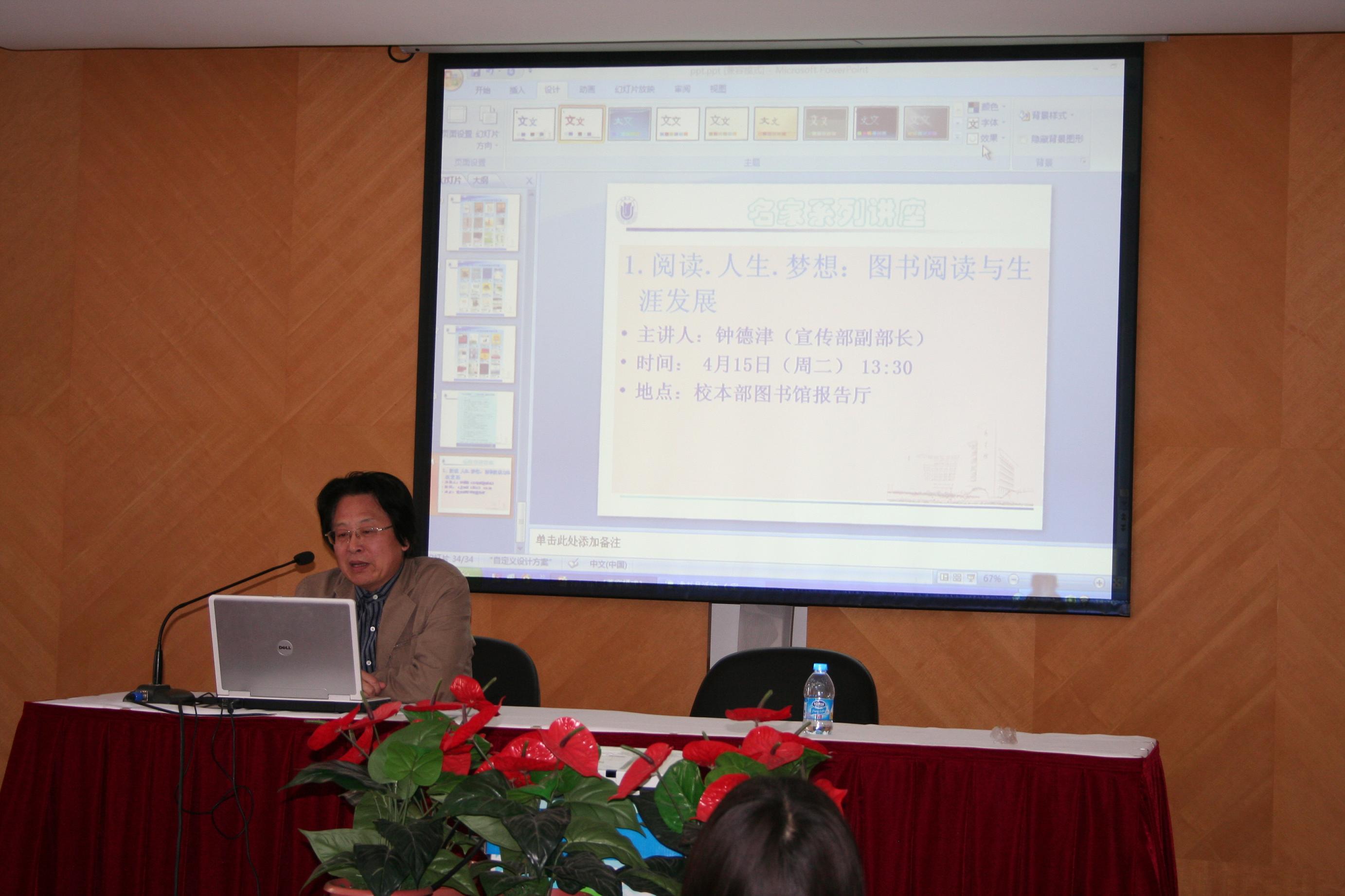 2014年4月15日下午,主题为“阅读、人生、梦想:图书阅读与生涯发展”专题讲座在校本部图书馆二楼报告厅隆重开幕,ac米兰官网中文网站宣传部副部长钟德津老师担任本次讲座主讲。