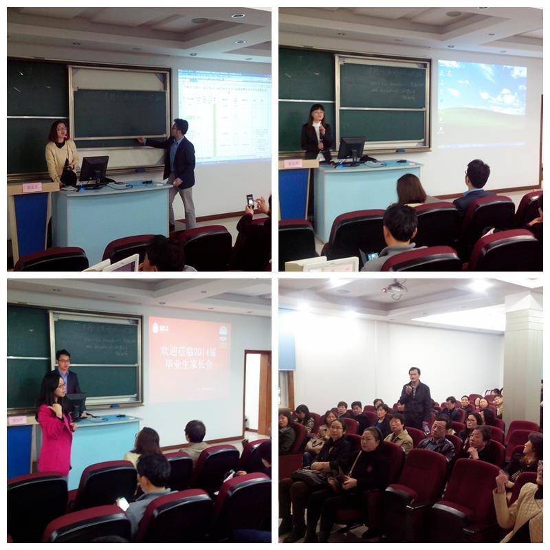 家长会伊始,2014届本科毕业班年级主管辅导员徐娴向大家介绍了年级的基本概况、目前的签约就业情况,并且向家长通报了学生们在毕业前还需完成的几大事项,尤其请家长们配合督促学生们做好毕业设计、未尽学业的完成及人身财产安全注意提醒,还预先发出了参加2014届毕业典礼的家长邀请。接着,就业主管曾晓琳围绕学院的就业总体工作和就业推进举措等做了简要介绍,并现场推介了17号学院即将举行的专场实习就业招聘会信息。学工办主任颜丽娜代表学生工作部做了最后的主题讲话,她首先表达了对家长的欢迎与感谢,同时向家长表达了学院将一如既往坚持以学生为本,进一步做好毕业生工作的立场与信心,同时对毕业生本人及家庭送去了美好祝福。家长会尾声,辅导员陆静还主持了Q&A环节进行现场互动,整个家长会历时一个半小时顺利结束。会后,老师们还被不少家长围住,进行个别交流,师生共话学生在校的学习和表现情况,相谈甚欢,共同为学生未来的长远发展进行谋划。