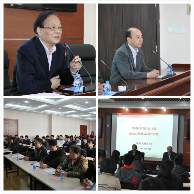 仪式开始,彭院长向大家介绍了翔英学院2011级企业培养进展情况:完成了岗位双向选择,企业导师、学校导师的选聘,企业培养期间保险购买,春季学期前2周7门企业培养课程的集中培训,卓越培养信息平台的建设等。