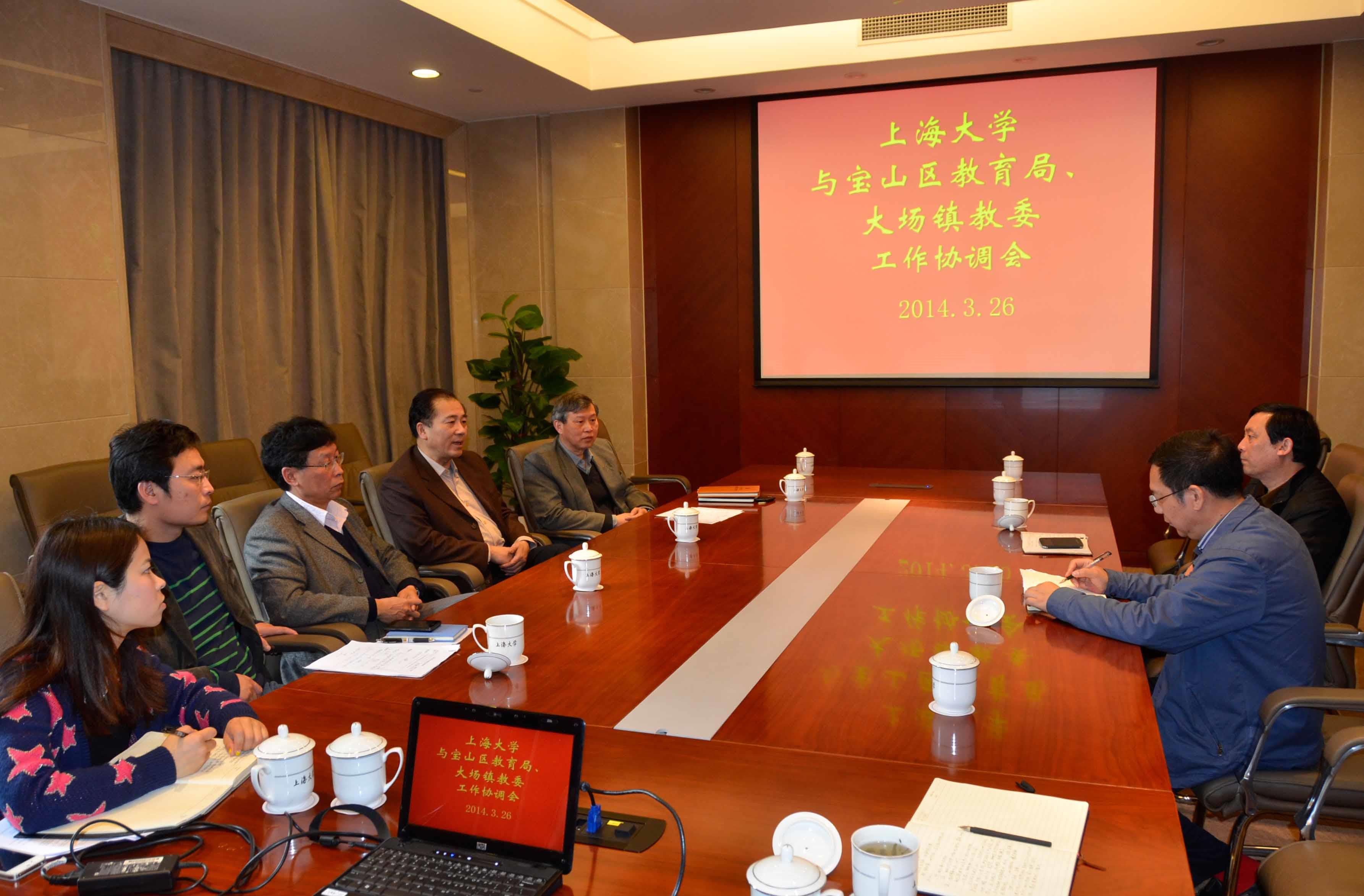 3月26日上午9点,ac米兰官网中文网站与宝山区教育局、大场镇教委在校本部乐乎新楼海纳厅举行工作会谈。校党委副书记、纪委书记、校工会主席忻平,宝山区教育局副局长陆荣林,大场镇教委主任左忠明,校办副主任吴英俊,校本部基建总指挥、原校工会主席薛志良出席了会议。