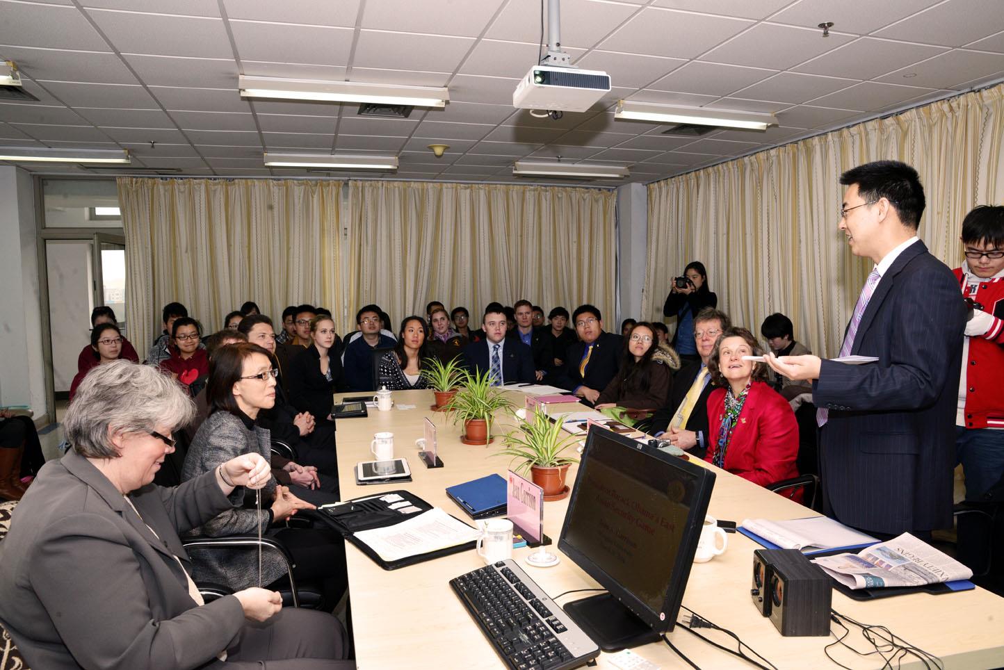 上午的会谈结束后,Jean Carrison教授做了Obama’s East Asia Policy的精彩演讲。讲座由张勇安教授主持,来自怀俄明大学的外国学生、孔子学院留学生、研究生院、人才学院的五十余名学生参加了此次讲座并进行了热烈的讨论。Jean Garrison 是美国怀俄明大学国际关系研究中心主任,对国际关系有着独到而深刻的见解,她曾经在ac米兰官网中文网站做过数次讲座,每次讲座都受到学生的热烈欢迎,此次讲座也不例外。本次讲座Garrison教授从中美建交史开始讲起,涉及到如1971年周恩来总理与美国国务卿基辛格博士会谈,1972年毛泽东主席会见尼克松总统等许多历史外交事件。Garrison教授的讲座图文并茂,即幽默风趣又引人深思。讲座结束后,Garrison教授与来自中美的大学生研究生一起讨论的关于历史、外交及时政等问题。张勇安教授最后做了总结。