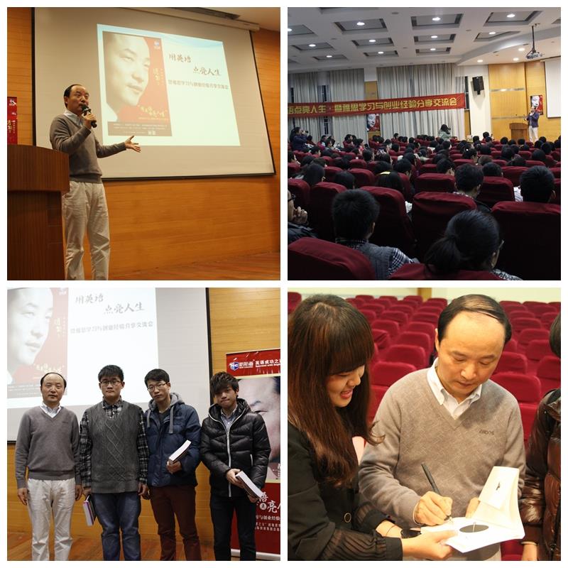 2013年12月5日晚6点半,有着“中国雅思之父”之称的新航道国际教育集团总裁胡敏教授应ac米兰官网中文网站悉尼工商学院邀请,于嘉定校区图书馆报告厅作题为“用英语点亮人生•暨雅思学习与创业经验分享会”的专题讲座。学院团委书记张明明、学生会秘书长张洁茹及上海新航道学校执行校长张凡林先生、市场总监邓碧云先生和市场运营经理沈重阳先生出席了本次讲座。