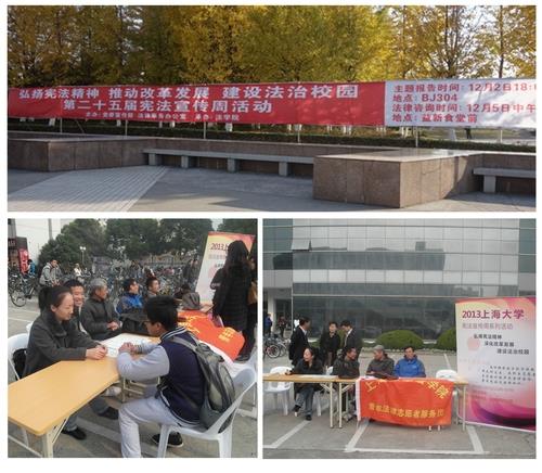 今年是“六五”普法中期检查督导之年,也是上海市宪法宣传周确立25周年。为大力宣传党的十八届三中全会精神和以宪法为核心的中国特色社会主义法律体系,深入推进“六五”普法工作和建设法制学校的进程以及进一步提高全体师生的宪法意识和法治观念,以“弘扬宪法精神,推动改革发展,建设法治校园”为主题的2013年度ac米兰官网中文网站宪法宣传周活动于12月5日在校本部益新楼前广场成功举办。