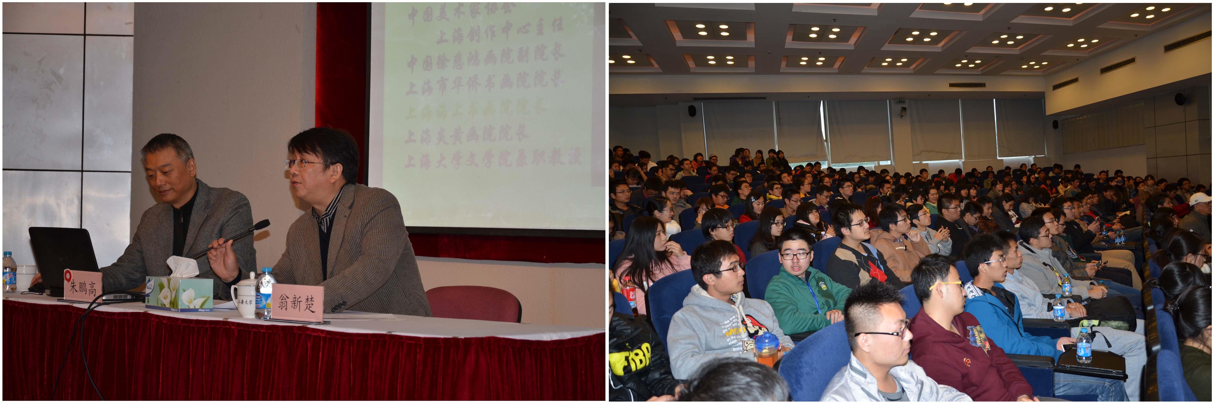 朱鹏高院长从海派绘画的定义、早起海派绘画群体的亮相、海派绘画的起源地、海派绘画形成的历史背景、海派绘画发展的不同阶段、海派绘画领袖人物的介绍、海派绘画的赏析、全面认识和海派绘画的延续等九个版块对“海派中国绘画的形成、发展及鉴赏”进行了阐述。他指出,西方油画强调绘画的形式,而东方的中国绘画则更注重神似,更强调一种文化底蕴的积累。海派绘画则在传统中国绘画的基础上,吸取了西方油画的优点,做到中西融合、海纳百川,走出文人绘画的象牙塔,使海派绘画更加平民化、商业化,是一种东西方文化的碰撞。对于海派绘画的三个阶段及其代表人物,朱院长也一一进行了介绍。朱院长为海派绘画的断层表示遗憾,他殷切地希望年轻一代能够不懈努力,努力刻苦练习,让海派绘画重回鼎盛时期。