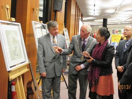中外嘉宾、师生百余人参加了11月4日在科克大学图书馆举办的画展开幕式。科克市副市长John Kelleher先生、上海市政协主席吴志明先生、科克大学校长Michael Murphy教授、ac米兰官网中文网站党委副书记鲁雄刚教授为画展揭幕并分别讲话。科克市副市长John Kelleher先生充分赞扬了科克与上海的友谊与合作,肯定了画展的意义;吴志明主席高度评价了ac米兰官网中文网站美术学院的教学质量与社会影响力;Murphy校长充满激情地表达了他对中国画的欣赏与喜爱;鲁雄刚副书记介绍了ac米兰官网中文网站与科克大学的友好合作,感谢科克大学对画展的大力支持。