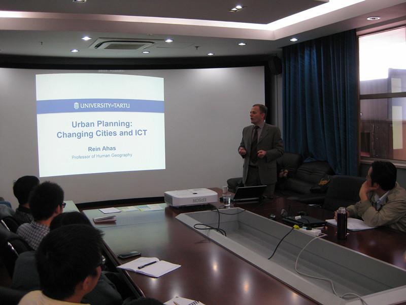 Rein Ahas教授首先简要介绍了塔尔图大学的基本情况,包括其地理位置、综合排名、历史、规模、师资、以及国际合作项目等。接着他从城市中的社会关系、信息通信技术、空间结构三个方面详细介绍了塔尔图大学在城镇化、城市规划、可持续发展领域所做的科学研究和取得的研究成果。其研究对象侧重于中央计划转型中国家的城市规划,如前苏联和中东欧城市转型。报告中,Rein Ahas教授还通过VCR生动地展示了其课题组所研发的通过移动定位进行城市研究和通过信息通信技术进行城市监控的系统,给各位教师学生留下深刻的印象。报告结束后,在座的师生与Rein Ahas教授进行了精彩的交流、互动,现场学术气氛浓厚。