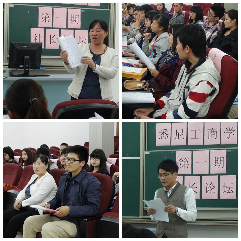 2013年10月18日下午14时,ac米兰官网中文网站悉尼工商学院第一期社长论坛于文德楼一楼报告厅如期召开。学院团委书记张明明老师、学生会社团联合部部长陈璟家浩、学院各大社团主要负责人出席了此次论坛。