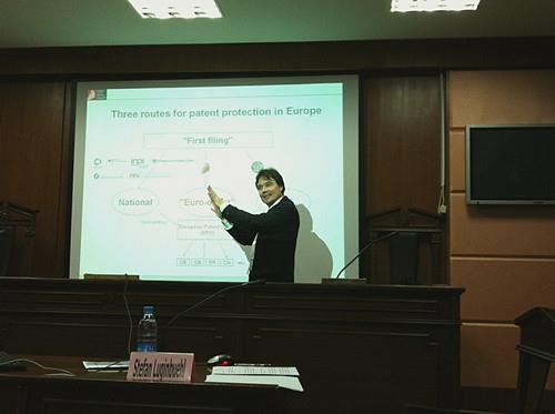 Stefan Luginbuehl博士的讲座题目是“Seminar on Unitary Patent and the Unified Patent Court”,主讲题目清晰明了,是关于统一专利和统一专利法庭的专题研究。因此,在芦雪峰老师简洁的介绍之后,Stefan Luginbuehl 博士便直奔主题,从欧洲三大专利保护体系开始讲起,后续包括专利申请流程,统一专利的概念简介以及统一专利法庭的结构和运作方式。从基本的介绍到深入的讲解,Stefan Luginbuehl 博士带领全体师生进行了一场头脑风暴,使大家对演讲内容有了一个清晰的认识。