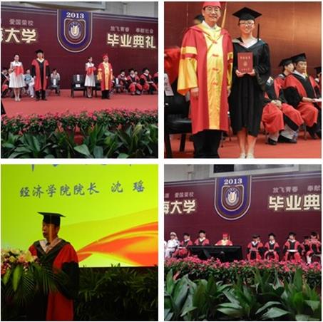 典礼现场座无虚席,气氛轻松融洽。毕业生身着学位服,显得格外精神。活动伊始,全体起立,奏唱国歌。首先,经济学院院长沈瑶教授作毕业致辞。他简单回顾了2013届毕业生们自进入大学以来的成长历程,并衷心祝愿他们前程似锦,同时希望他们今后继续关注经济学院的发展。紧接着毕业典礼进入高潮部分,即全体毕业生学位授予仪式。2013届优秀毕业生、博士生、专业硕士、留学生以及其他本科生依次上台。于信汇教授微笑着为毕业生们拨转流苏,郑重地将毕业证书交到他们手中,并亲切地与每位毕业生合影留念。徐旭教授则向每位毕业生颁发贺信。整个学位授予环节在轻快活泼的音乐声中有序进行。