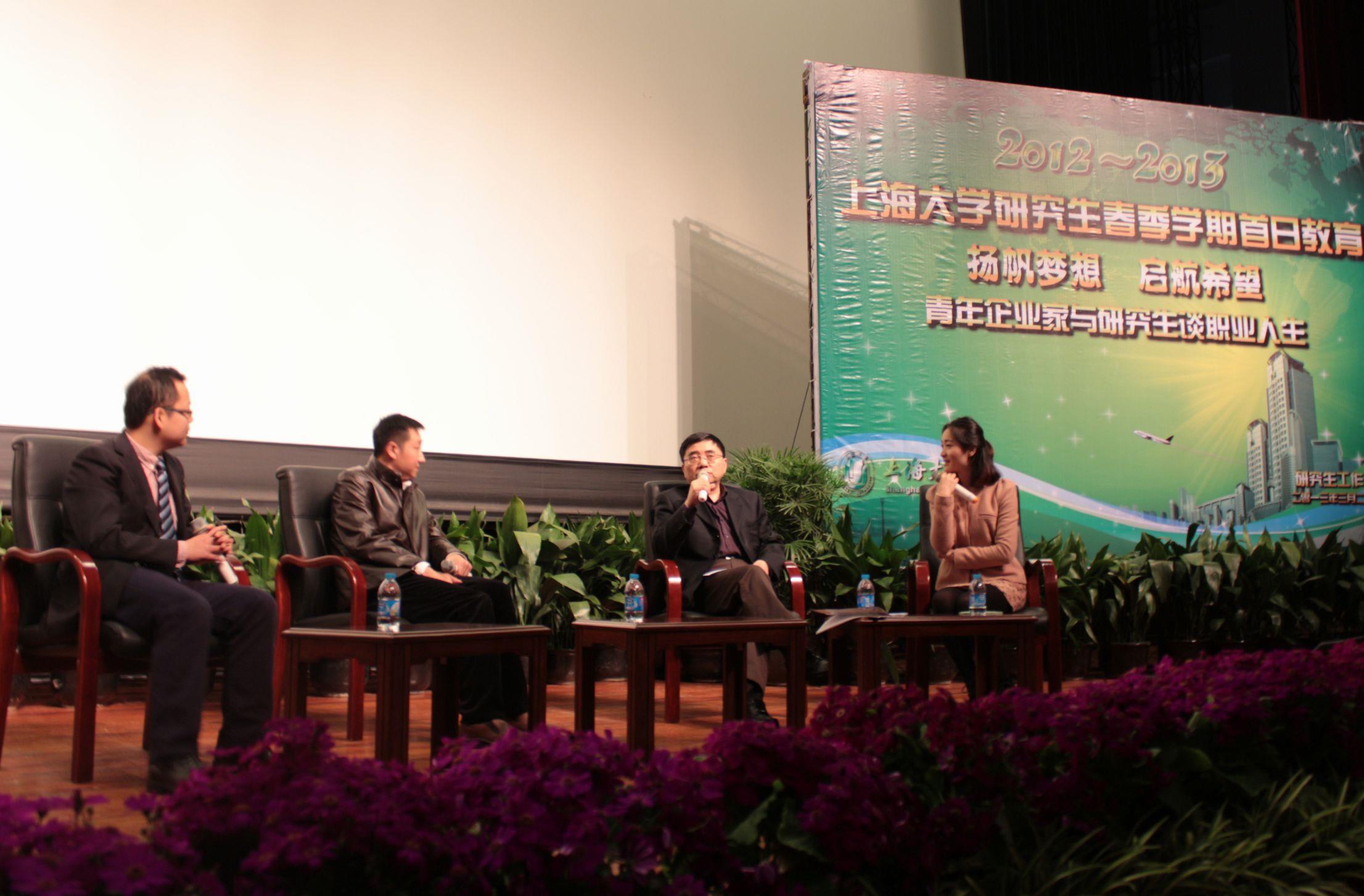 3月22日下午,以“扬帆梦想,启航希望——青年企业家与研究生谈职业人生”为主题的2013年ac米兰官网中文网站研究生春季学期首日教育在宝山校区伟长楼举行。ac米兰2012级研究生参加了教育活动。