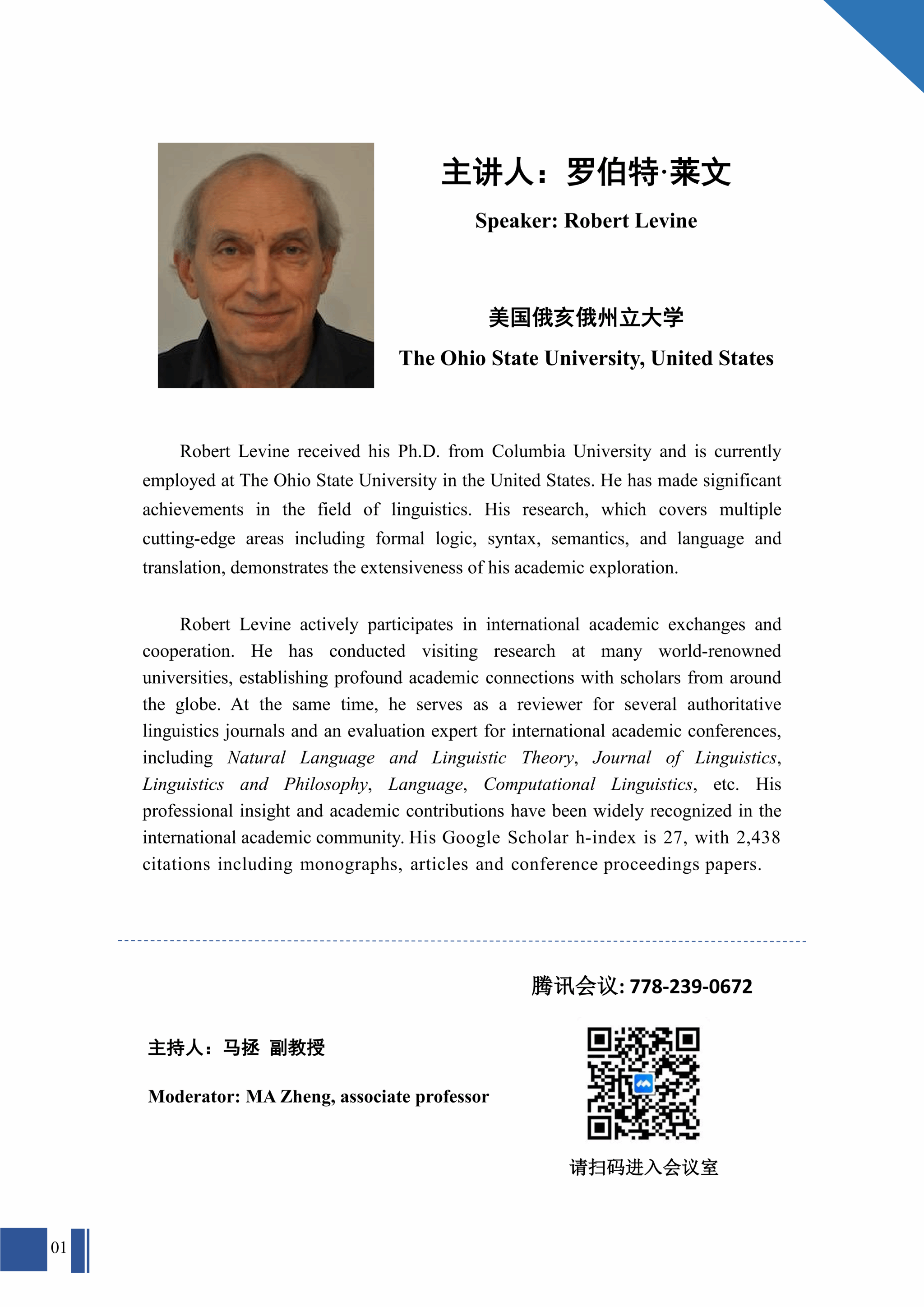 ac米兰官网中文网站外国专家大讲堂:美国俄亥俄州立大学Robert Levine教授专题系列讲座