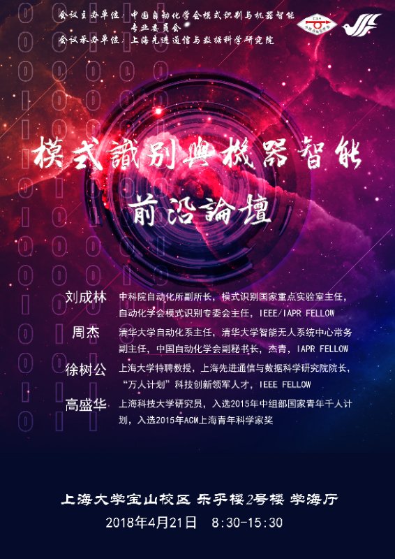 为进一步推进人工智能的技术突破、产业发展以及应用,本次模式识别与机器智能前言论坛由中国自动化学会模式识别与机器智能专业委员会主办,上海先进通信与数据科学研究院承办,论坛将汇聚国内人工智能领域的专家、学者和产业界的优秀人才,围绕当前模式识别与机器智能领域的热点话题、核心技术及大家共同关注的科学问题进行深入交流和讨论。