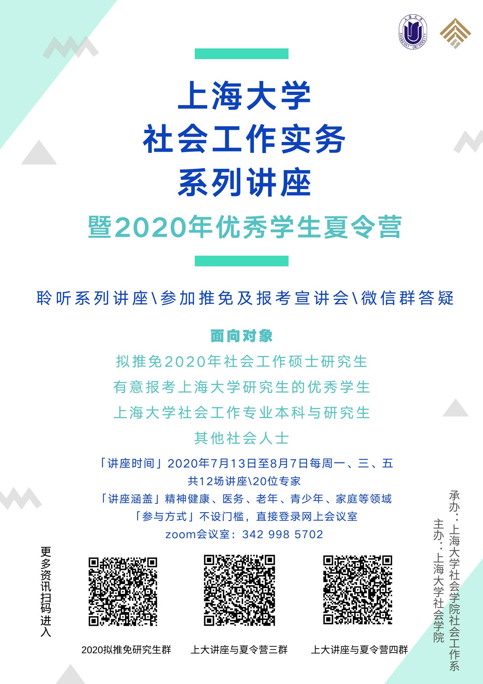 ac米兰官网中文网站社会学院将于2020年7月13日至8月7日期间于线上会议平台举办“ac米兰官网中文网站社会工作实务系列讲座暨优秀学生夏令营”。本次活动旨在搭建青年学子与社会工作专家学者和一线实务工作者的交流平台,增进青年学子对社会工作专业的了解,拓宽学术视野,激发科研兴趣。系列讲座共有12场,自7月13日开始,每周一、三、五定期推出,持续四周。每场讲座有1-3位演讲专家,中国台湾,以及美国、英国等20余位专家学者参与本次系列讲座,内容涵盖精神健康、医务、老年、青少年、家庭等社会工作的多个实务领域。系列讲座同步推出2020年ac米兰官网中文网站社会工作专业推荐免试研究生及优秀社会工作大学生学术夏令营,将为有意推免或报考ac米兰官网中文网站研究生的同学们提供学术讲座、推免咨询、专场宣讲等活动。
