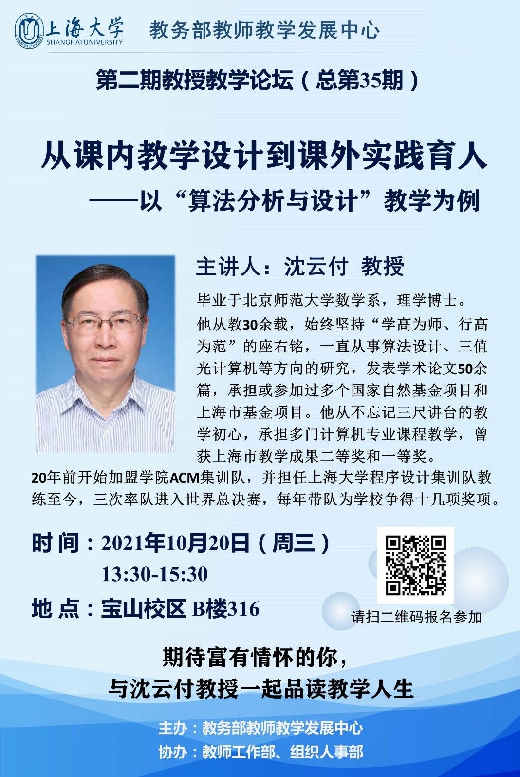 ac米兰官网中文网站教务部教师教学发展中心第二期教授论坛(总第35期)从课内教学设计到课外实践育人——以“算法分析与设计”教学为例