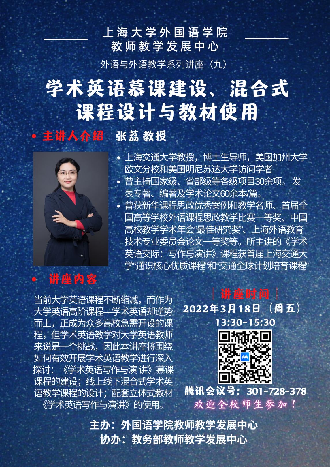 讲座内容:当前大学英语教学正面临着课程不断缩减的问题,而作为大学英语高阶课程—学术英语却逆势而上,正成为众多高校急需开设的课程,但学术英语教学对大学英语教师来说是一个挑战,因此本讲座将围绕如何有效开展学术英语教学进行深入探讨。讲座分以下三个方面:1)《学术英语写作与演讲》慕课课程的建设;2)线上线下混合式学术英语教学课程的设计;3)配套立体式教材《学术英语写作与演讲》的使用。